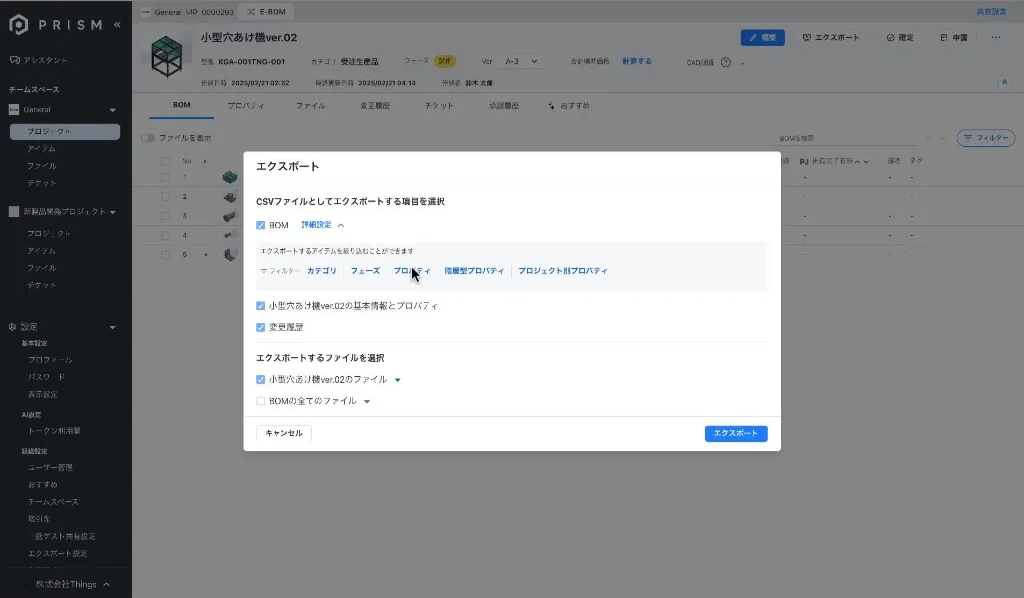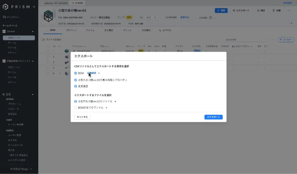 - エクスポートモーダルが表示されます。デフォルトでは「BOM」および「小型穴あけ機ver.02の基本情報とプロパティ」などの出力項目にチェックが入っています。