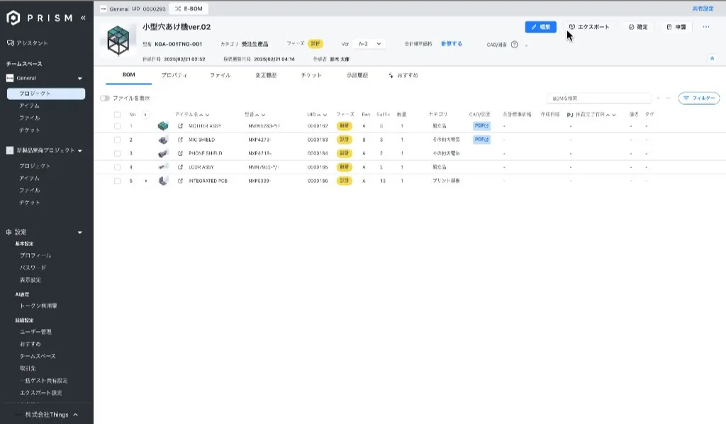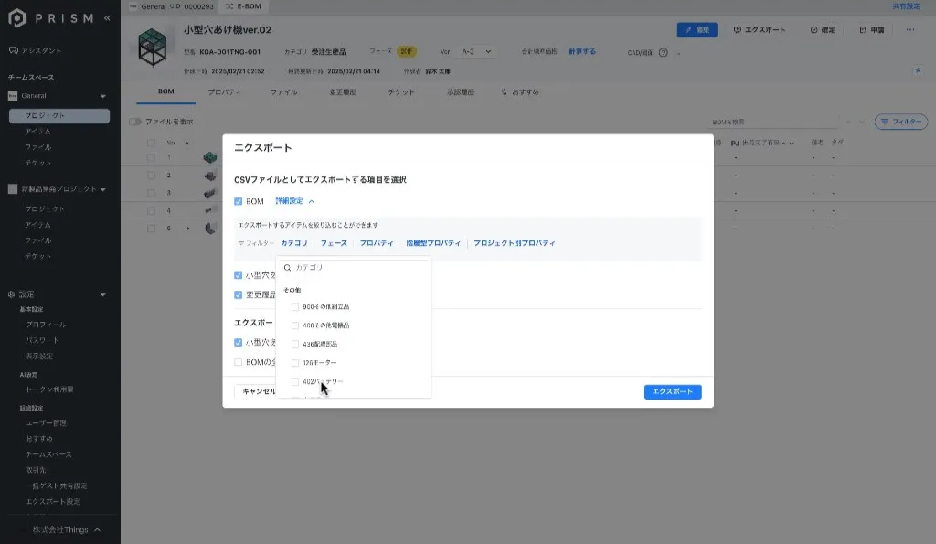 - プロジェクトのBOM(部品表)をCSV形式でエクスポートする際、カテゴリやフェーズなどでアイテムを絞り込み、必要な項目だけを出力できます。