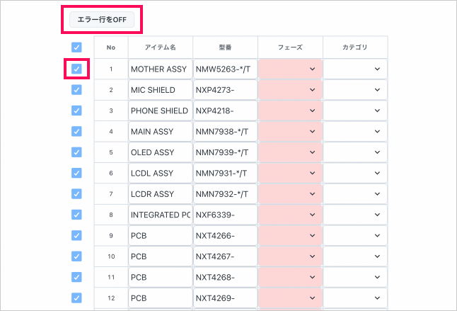 上の画像のように、セルが赤色になってしまいインポートできないアイテムは、左側のにチェックを入れて左上のをクリックするとまとめて除外することができます。