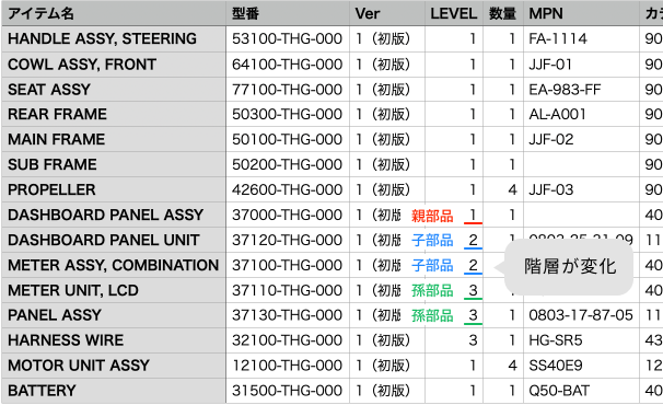 - LEVEL:階層情報は「LEVEL」列で判別されます。LEVELを先頭行から読み取り、数字が増加する行(例:1→2)を、直前の行の子部品と認識します。他の名称(例:階層、レベル)になっている場合は、「LEVEL」に書き換えてください。